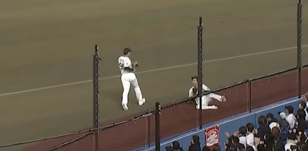 藤原選手がファールフライをスライディングキャッチ。
