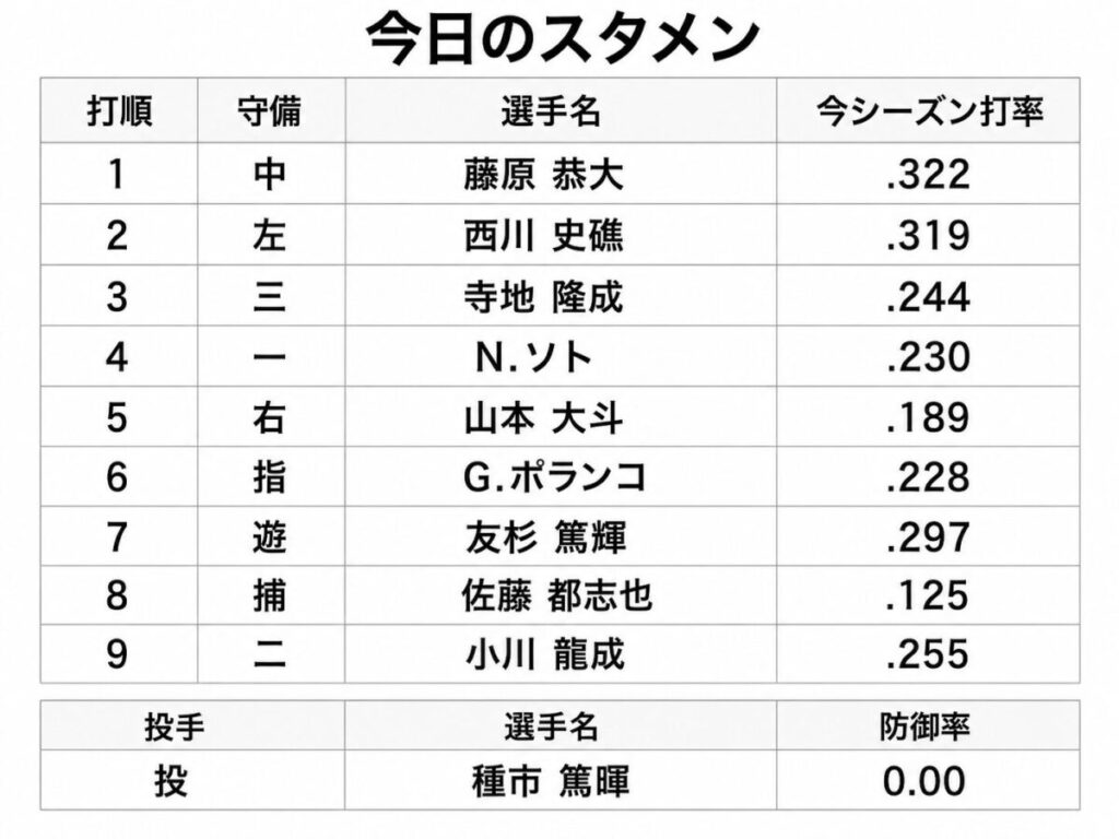 井上広大選手や池田来翔選手が1軍に上がってきましたが、この日はベンチスタートです。