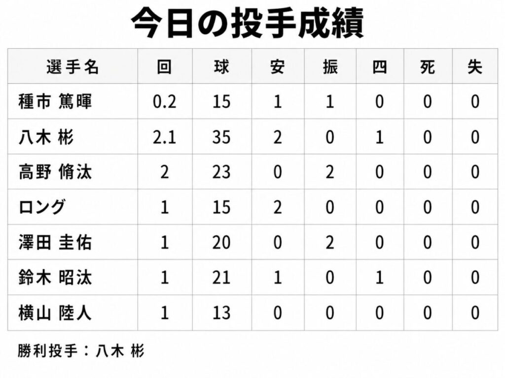 2番手に登板したのは八木彬投手でした。まだ十分に肩もでき上がっていない状態で、二死三塁という場面からのマウンド。四球を1つ出したものの、山川穂高選手をサードゴロに打ち取り、先制を許しません。そのまま3回まで無失点に抑える好投を見せました。