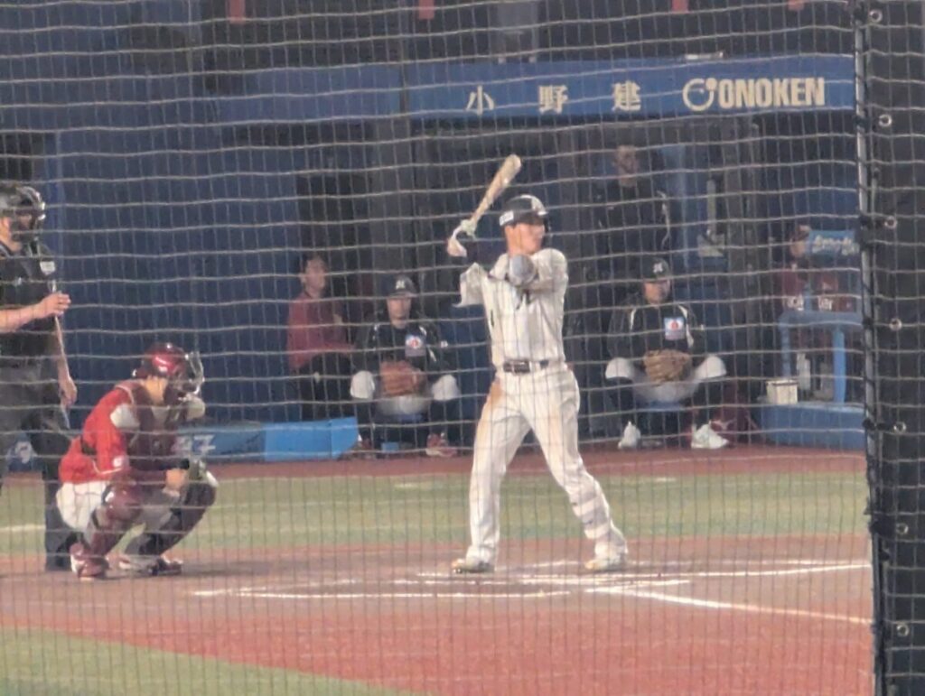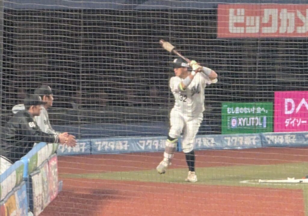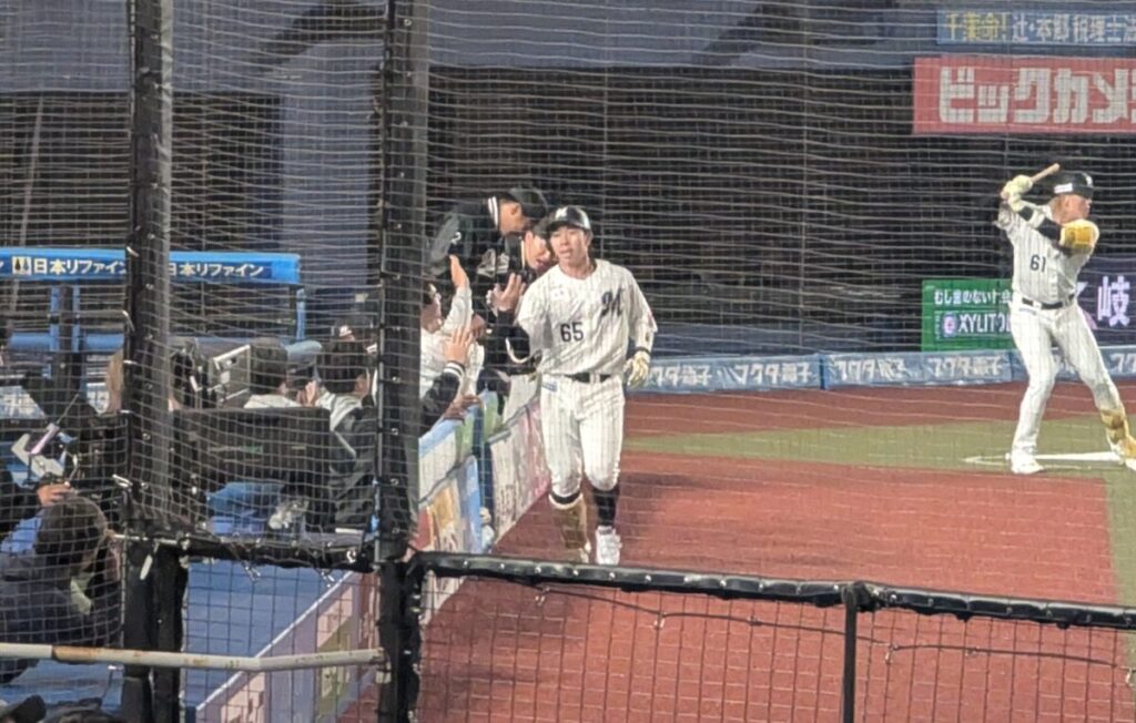 5回二死から友杉選手がヒットで出塁し、盗塁を決めて二死二塁。そこで打席に入ったのは、熊本でヒーローになった佐藤都志也選手でした。一、二塁間への打球に、正直「調子が悪いときの都志也さんかな」と一瞬思いましたが、打球はしぶとくライトへ抜けてタイムリーヒット。深く守っていた内野の間を抜き、友杉選手のナイスランもあってロッテが先制します。その後もヒットと四球で満塁まで広げましたが、ここは追加点ならず。先制はしたものの、まだ完全に流れをつかみきった感じではありませんでした。
