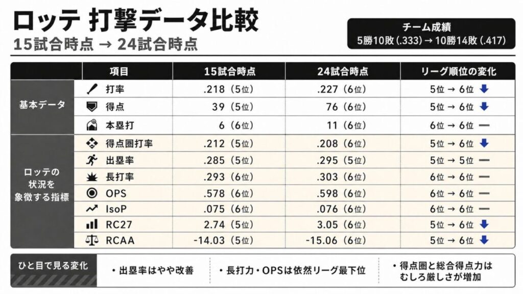 ただし、数字全体を見ると、まだ安心できる段階ではありません。24試合消化時点でも、得点76、打率.227、長打率.303、OPS.598、本塁打11、得点圏打率.208はいずれもリーグ最下位です。