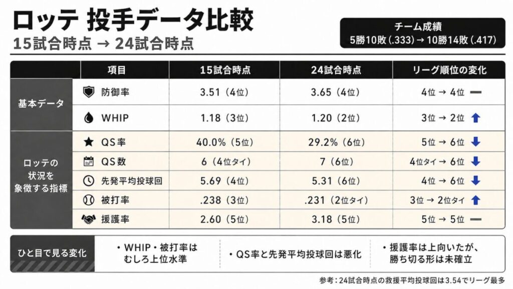 さらに厳しいのは、QS関連の数字がすべて最下位である点です。QS率29.2%、QS数7、HQS率12.5%、SQS率12.5%はいずれもリーグ6位。15試合消化時点で6試合あったQSは、24試合時点でも7試合にとどまっており、その間の9試合で増えたQSは、4月17日の楽天戦で種市投手が記録した1試合だけでした。つまり、先発が安定して試合を作れていないという課題は、改善どころかむしろ濃くなっているとも言えます。