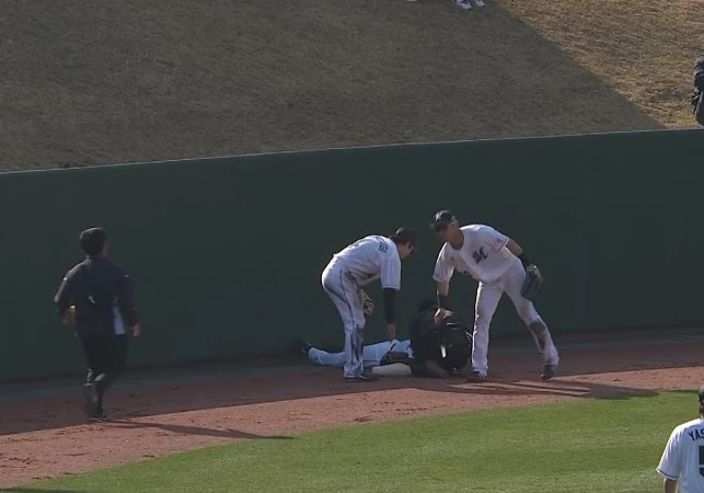 9回にファールフライを追いかけてフェンスに激突。かなりの衝撃だったようです。無事を祈ります。