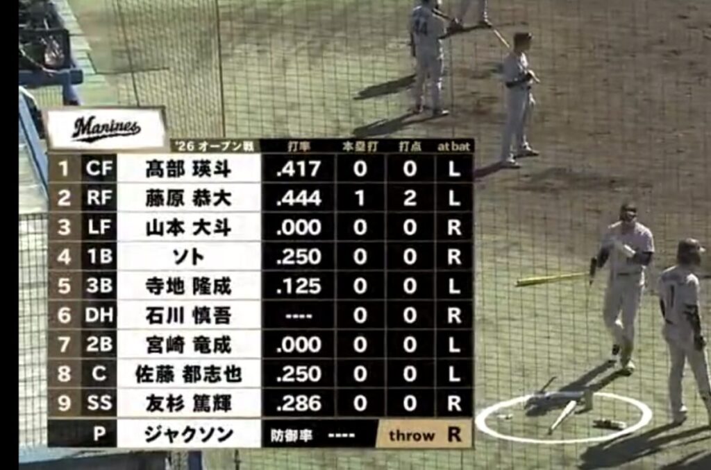 千葉ロッテ:ジャクソン、澤田、宮崎颯、鈴木、大聖、坂本 ― 佐藤、立松