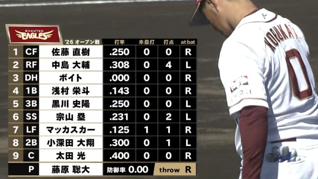 東北楽天:藤原、津留崎、伊藤樹、内、九谷、江原、柴田 ― 太田、石原