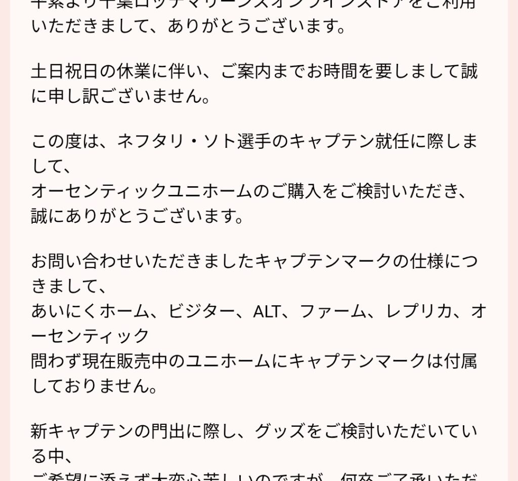 ロッテの2026ユニフォーム、今年はソトを購入しようかなと思い、カスタマーサービスに問合せしてみましたが、残念ながらキャプテンマークは付いていないそうです。